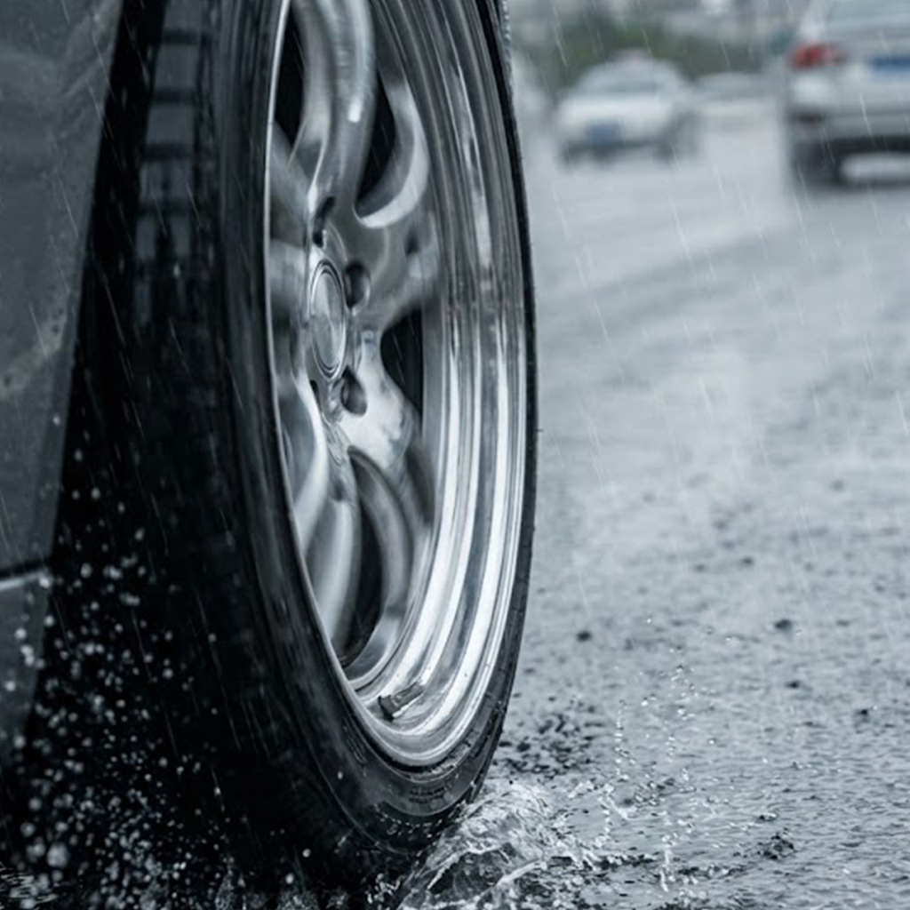 비 오는 날, 거친 도로 위를 힘차게 달리는 자동차 타이어 광고,